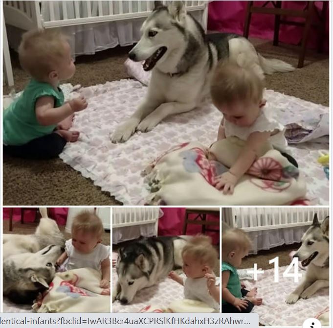 Baby twins Kaylee and Hailey have become this husky’s best playmates and laughing partners.